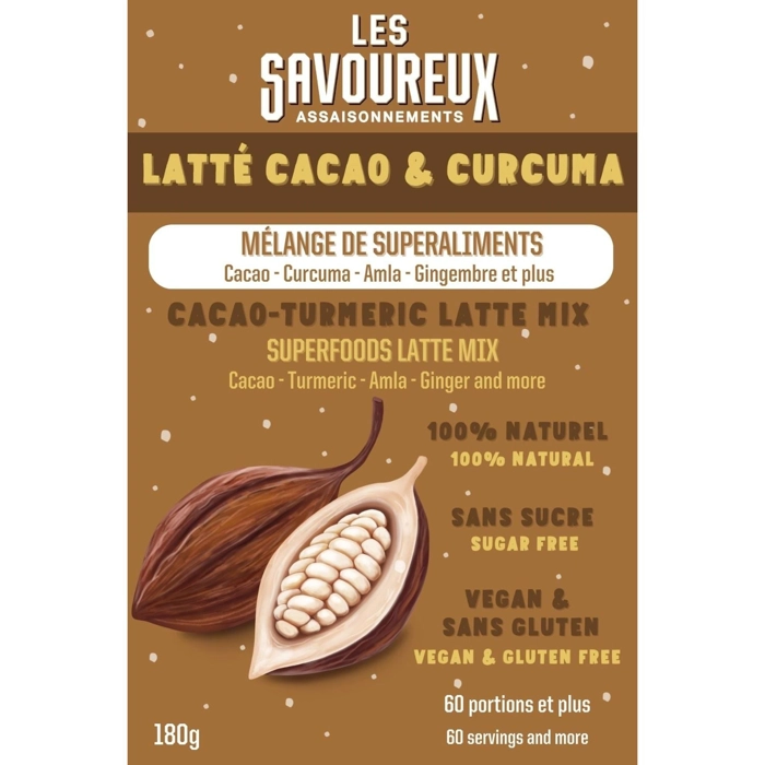 Les Savoureux vous a concocté un mélange magique LATTÉ CACAO & CURCUMA composée de superaliments 100% naturels, sans gluten, sans lactose, sans sucre. Cacao, Curcuma (curcumine), Amla, Gingembre, ...