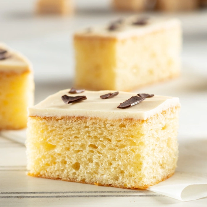 Délicieuse pâte à la vanille glacée d’un riche glaçage sucre à la crème, décorée de délicats morceaux de chocolat.