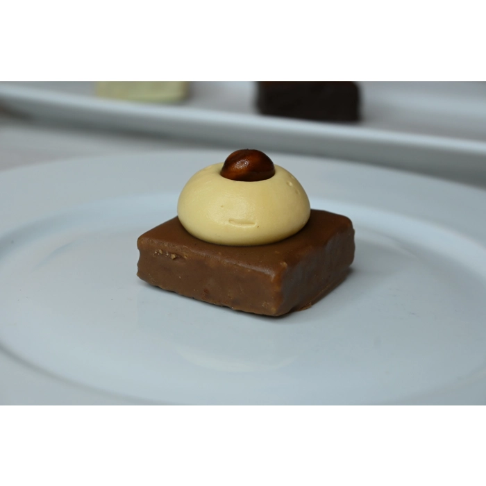 Blondie garnie d'une ganache au caramel et enrobé de chocolat.