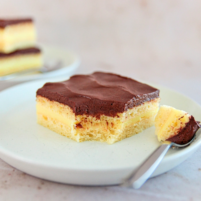 Délicieuse superposition de deux pâtes à la vanille, entrecoupées d'une onctueuse crème pâtissière, le tout nappé d’une douce crème au chocolat.
