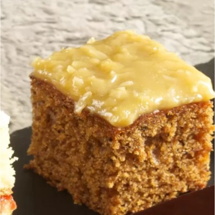 Pâte aux dattes surmontée d’un appareil à la noix de coco.