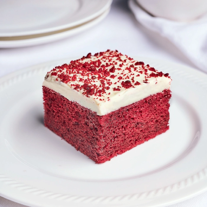 Pâte rouge velours recouverte de crème au fromage. Le tout garni avec du crumble de pâte rouge velours.