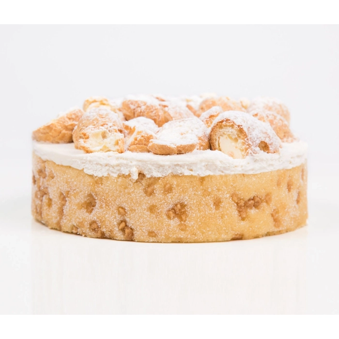 Pâte vanille entrecoupée de sucre à la crème et recouverte d'une mousseline à la vanille. Le tout décoré de choux à la crème et de sucre en poudre.