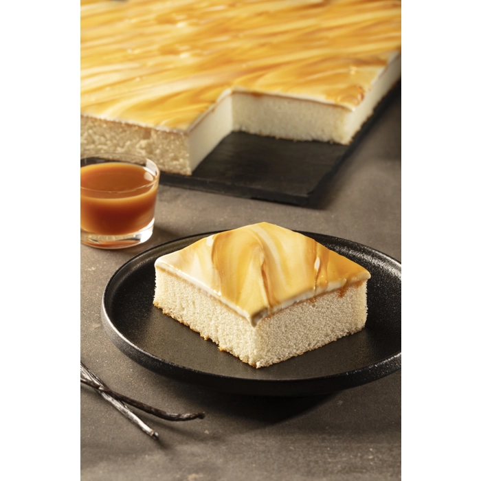 Gâteau à la vanille recouvert de glaçage onctueux avec un tourbillon de caramel.