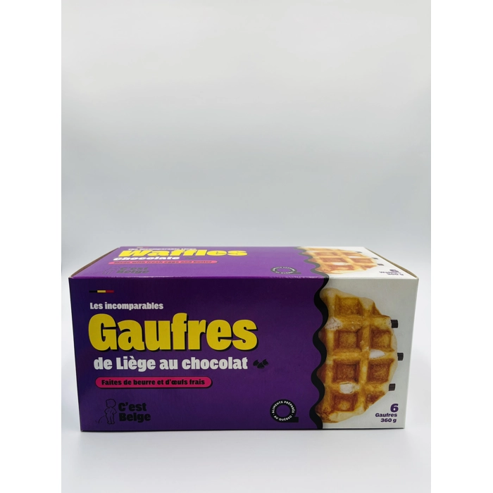 Gaufre de liège au chocolat belge faites de beurre et d'oeufs frais, sucre perlé, levure fraîche. Le tout est produit et emballé directement dans nos restaurants de Granby.