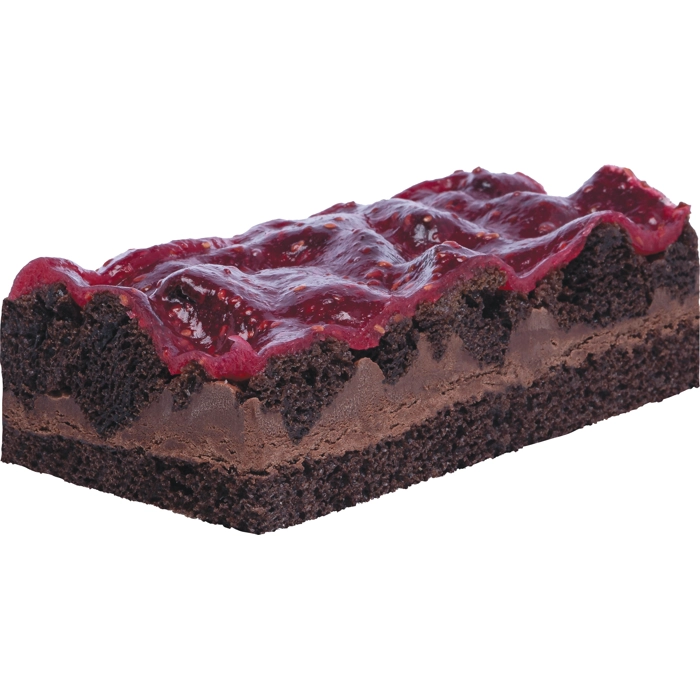 Pâte chocolat garnie de mousseline chocolat, décorée de cubes de pâte chocolat et d'une garniture aux framboises.