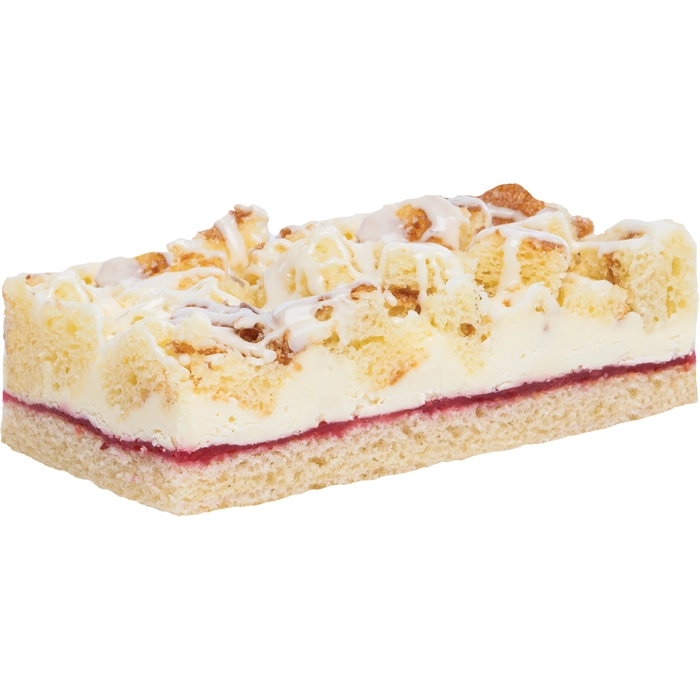 Pâte vanille recouverte de garniture aux framboises et d'une mousseline au citron, décorés de cubes de pâte vanille et ligné de chocolat blanc.