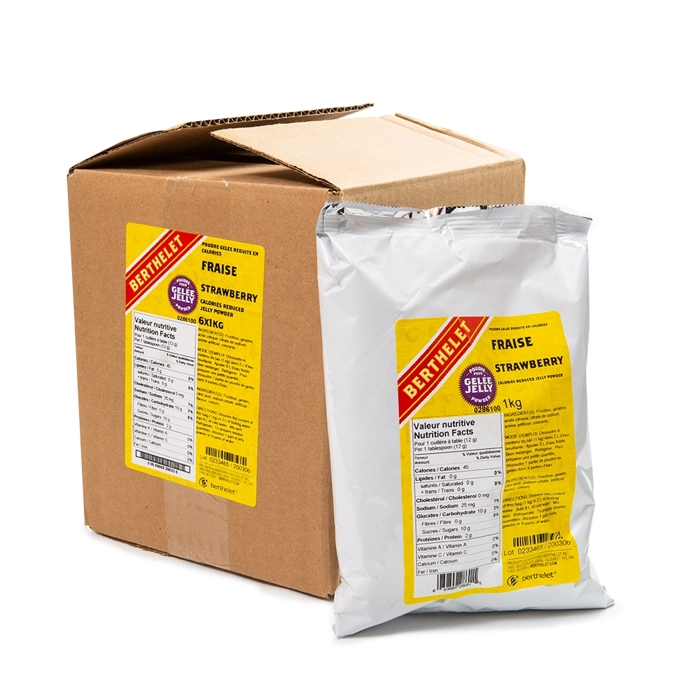 Mélange d'ingrédients secs créé pour obtenir une poudre de gelée faible en calories au bon goût de fraise.