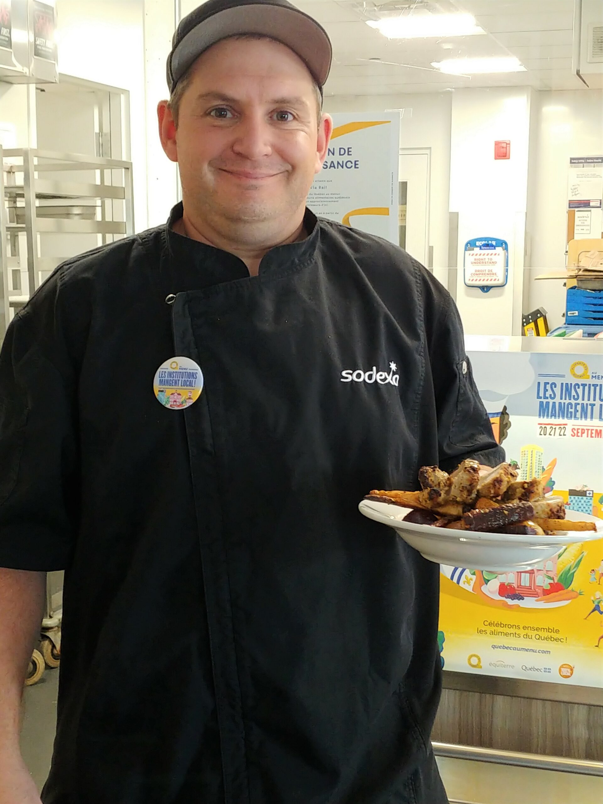 Jonathan Garand, chef et gestionnaire VIA Rail à Montréal avec le service alimentaire Sodexo, a participé pour la première fois à l’événement Les institutions mangent local!, du 20 au 22 septembre dernier. Pour s’inspirer, il avait fait des recherches de recettes, et au lieu d’en sélectionner, il a décidé de toutes les faire en prolongeant l’expérience sur cinq jours : « Ça me permet de découvrir des produits et des façons de les cuisiner, car même si j’ai déjà mes recettes, je vise toujours à les améliorer. Je peux par exemple tester plusieurs bières noires de microbrasseries du Québec pour voir celle qui s’agence le mieux avec un bœuf braisé. C’est un challenge et ça change de la routine ! »