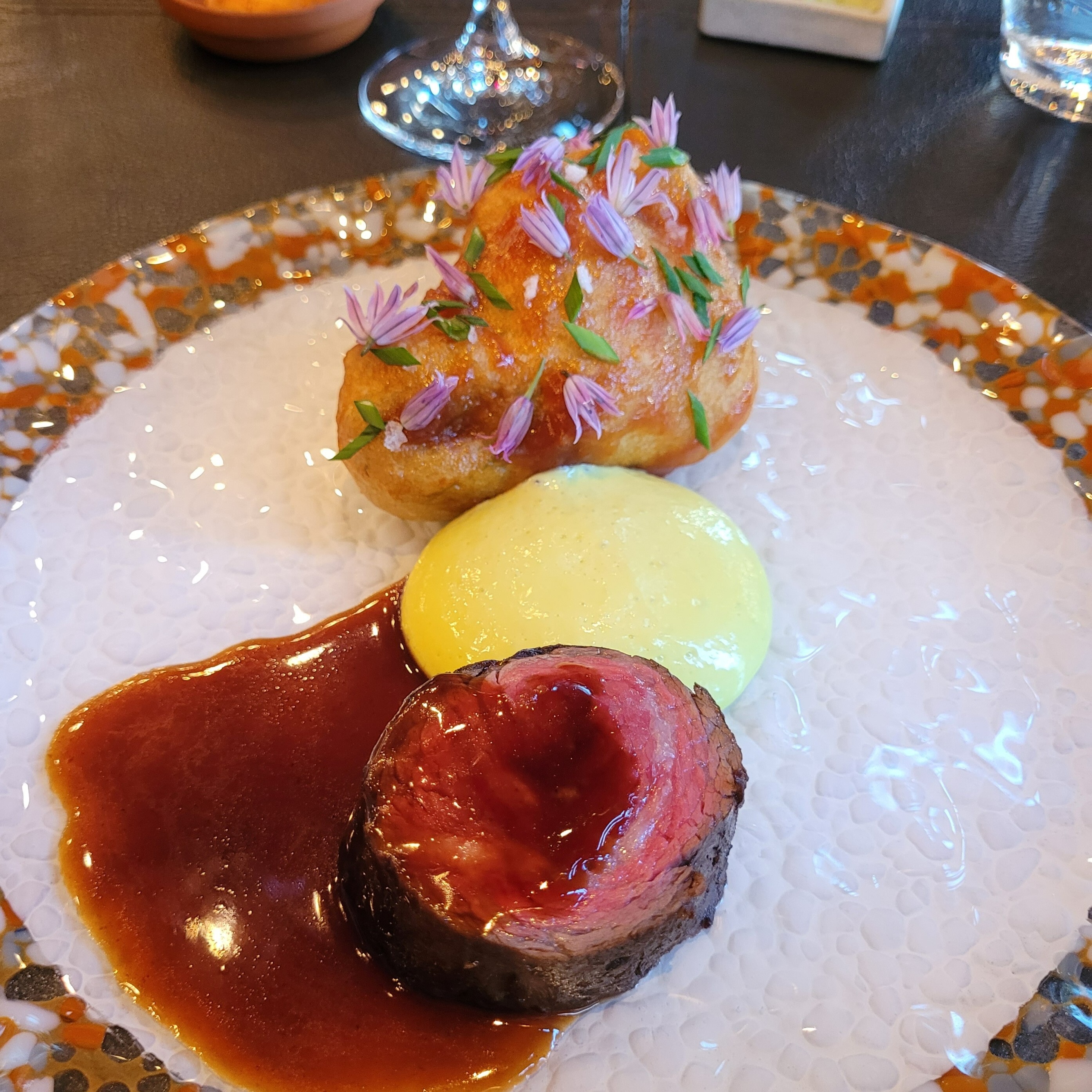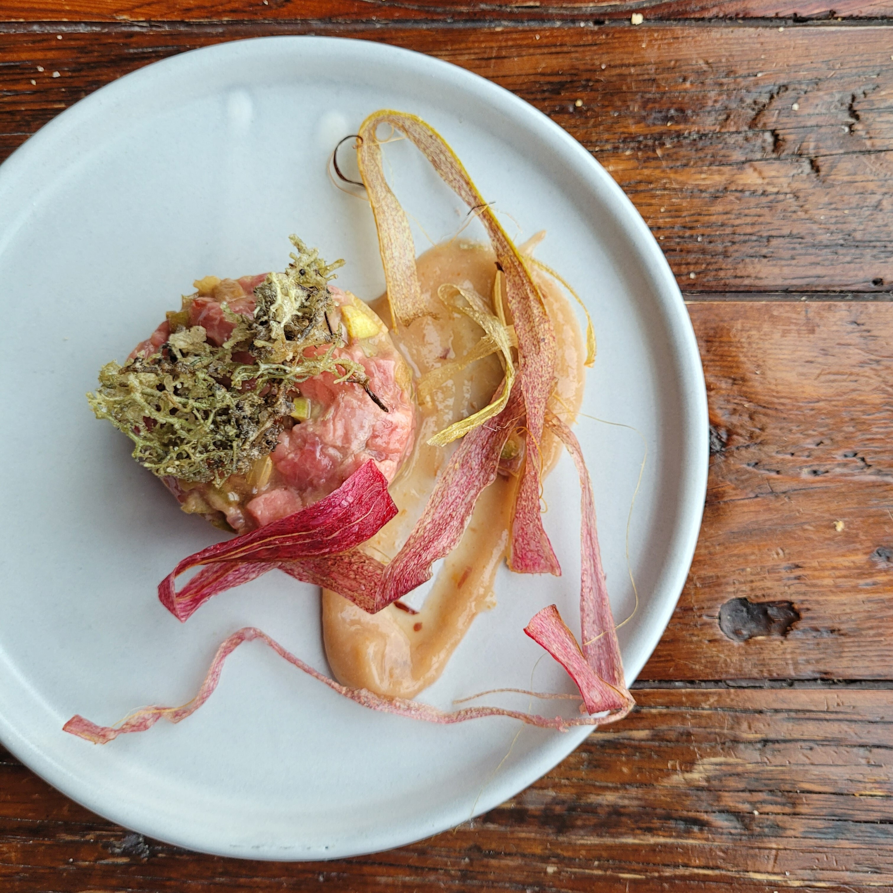 Même constat pour les tomates confites, celles-ci mariées à une ricotta maison faite à partir de lait Jersey 2A (donc naturellement sans lactose), d’échalotes frites et « pepsées » (relevées) d’une huile de mélisse pour la fraîcheur rappelant le citron. Vous comprendrez qu’à ce moment, le pain (ou la focaccia maison) ne peut plus se faire attendre. Si le tartare de bœuf avec une déclinaison de rhubarbe était une très bonne idée, je suis d’avis que ce plat aurait mérité une petite révision quant au ratio des différents éléments de la rhubarbe, celle-ci en cubes, en purée et frite.