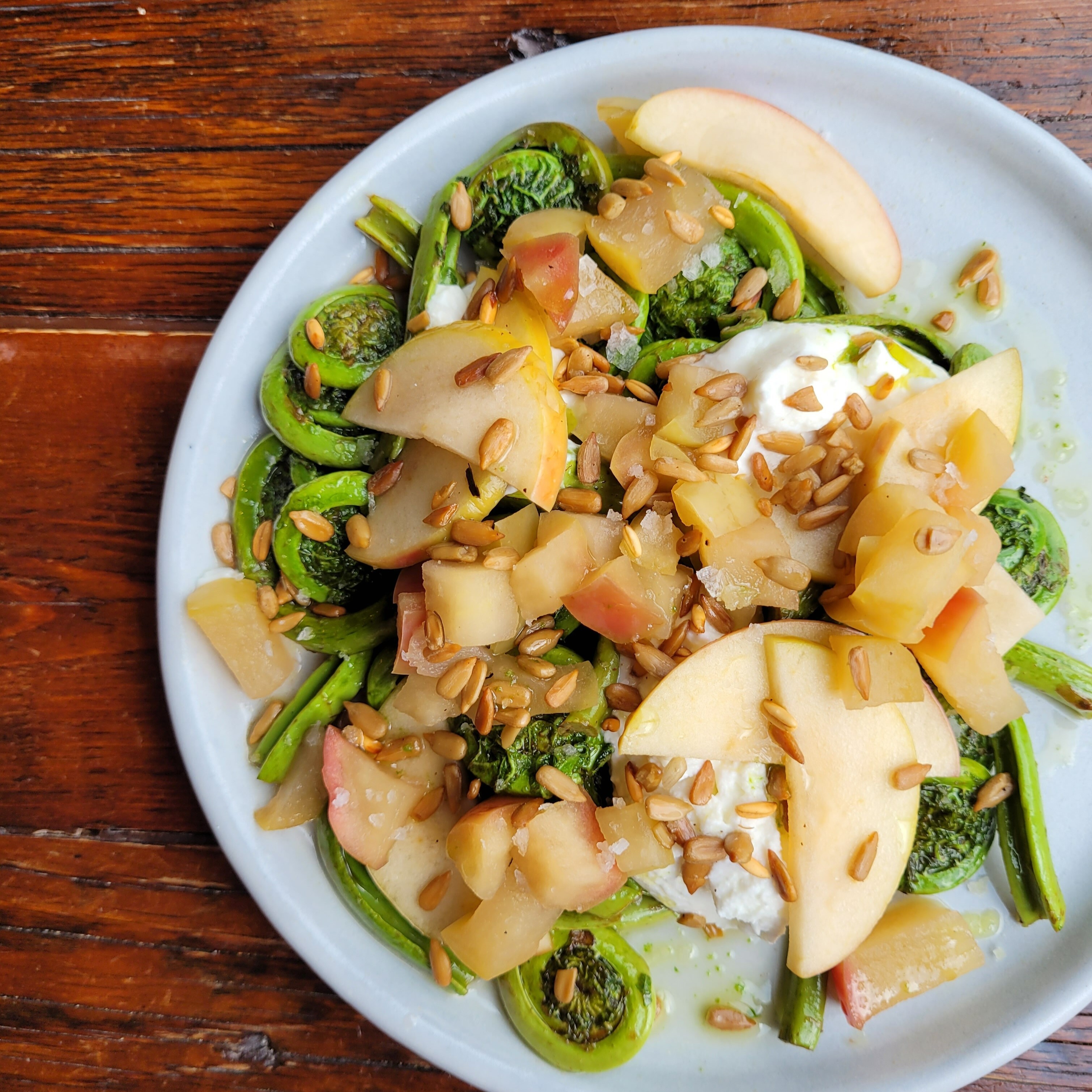Au contraire, c’est un orchestre de verdure dans l’assiette, siégeant sur des louches de beurrasses de chèvre de la fromagerie du coin, puis agrémentées de cubes de pommes rôties et en lanière marinée, avant d’être arrosée d’une huile verte (souvent fait à partir de tiges d’herbes fraîches). Il n’y a pas de flafla, toutes les saveurs annoncées poinçonnent présentes, et c’est très bon !