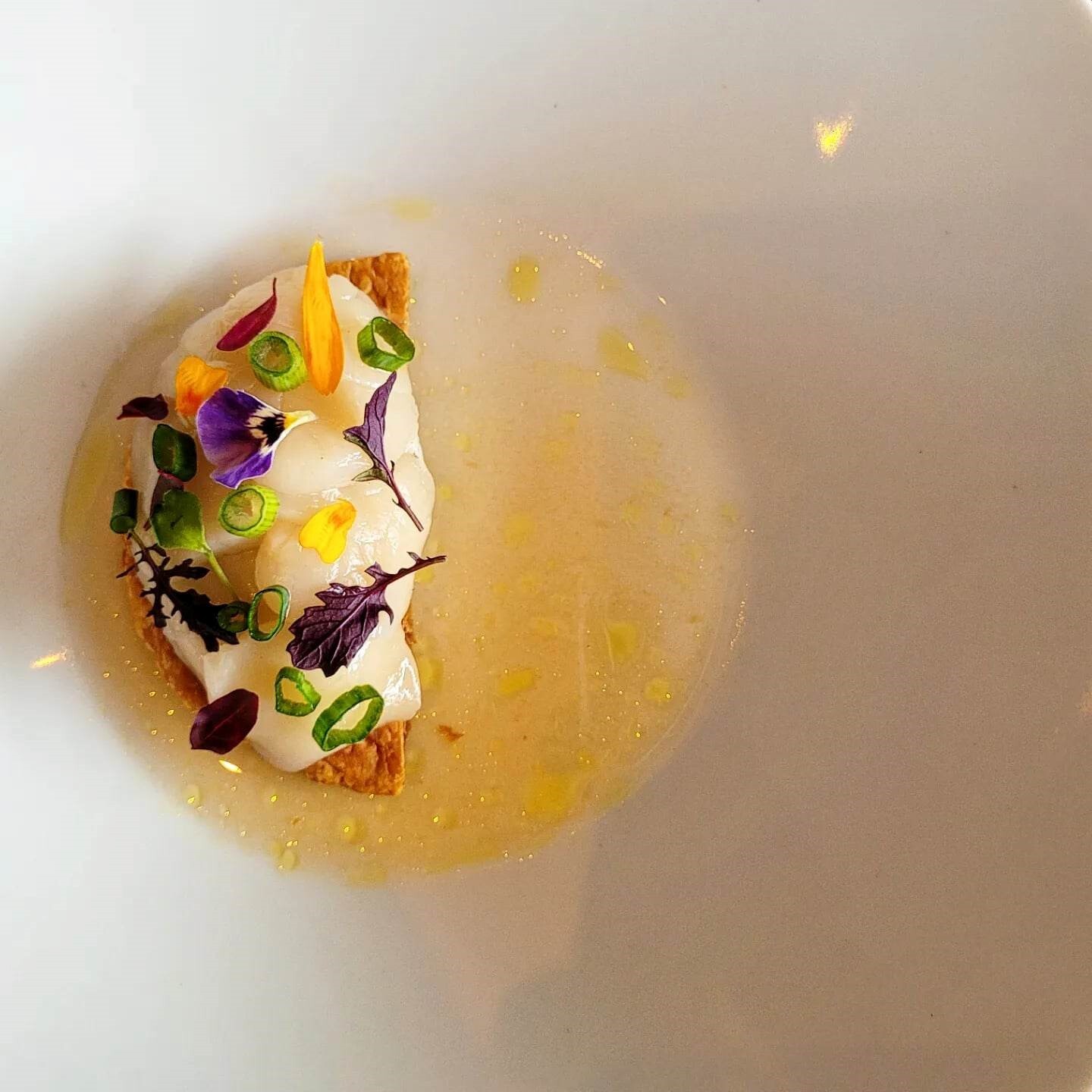 Une tartelette feuilletée craquante, sur laquelle se pose successivement des jeux de textures et de saveurs contrastantes : purée de céleri-rave, pétoncles fondants marinés minute d’un jus acidulé de yuzu et de pommes centrifugées, micropousses. Au moment où je me suis dit qu’une gourmandise supplémentaire n’aurait pas fait de mal pour créer la liaison parfaite entre le feuilletée et le pétoncle, je me suis aussi rappelé que nous sommes uniquement au premier service. Attendons de voir la suite.