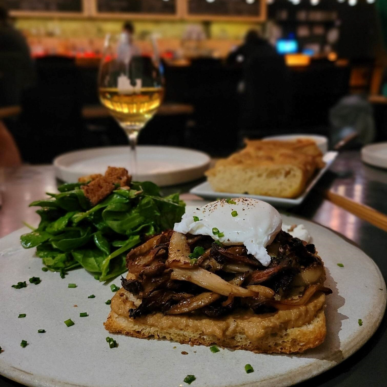 Même constatation pour les plats sans prétention qui sont servis, dont certains sont au menu depuis le tout premier jour. Parlons de la focaccia maison, figurant un peu comme le centre d’attraction du menu, servi autant en sandwich, en tartine de saison, ou simplement à plonger dans les tartinades faites sur place. D’ailleurs, j’ai particulièrement apprécié la tartine de champignons locaux, dont l’œuf coulant et le labneh viennent adroitement arrondir l’intensité du miso.