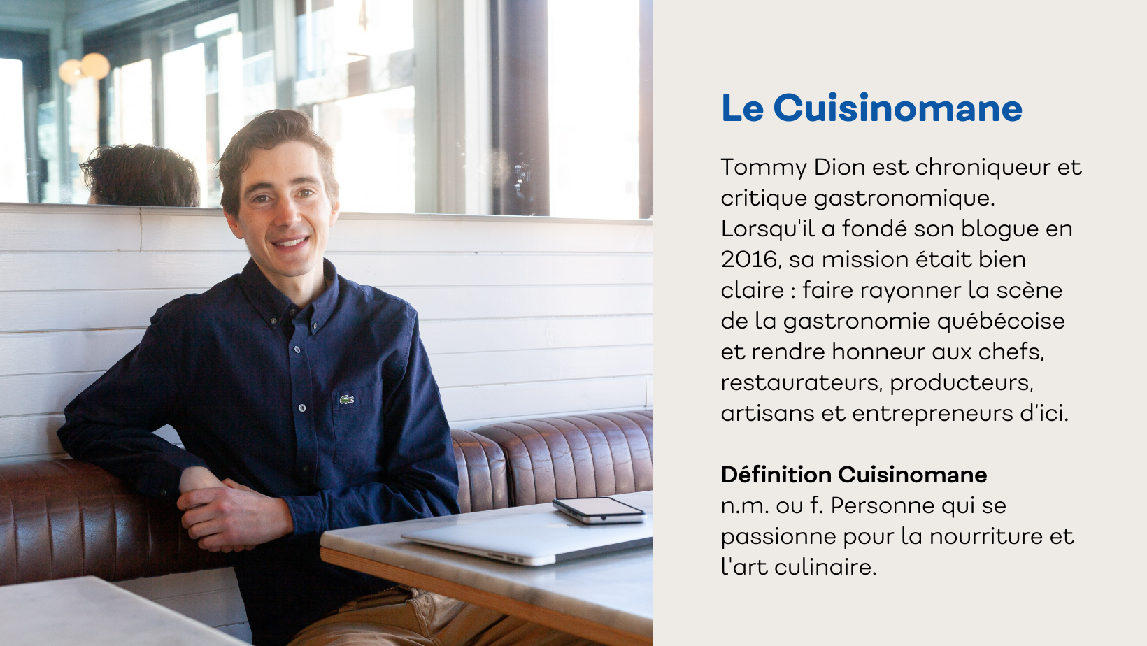 Tommy Dion est chroniqueur et critique gastronomique, mieux connu sous le nom du Cuisinomane, qui se définit comme une personne qui se passionne pour la nourriture et l’art culinaire. Lorsqu’il a fondé son blogue en 2016, sa mission était bien claire : faire rayonner la scène de la gastronomie québécoise et rendre honneur aux chefs, restaurateurs, producteurs, artisans et entrepreneurs d’ici. Il était donc tout naturel pour lui de prendre la route du Québec pour aller déguster le meilleur d’ici dans différents restaurants reconnus au programme « Aliments du Québec au menu ». Il nous partage ses trois découvertes gourmandes du dernier mois : Darna Bistroquet, Les Insulaires – Microbrasseurs et Régine Café.