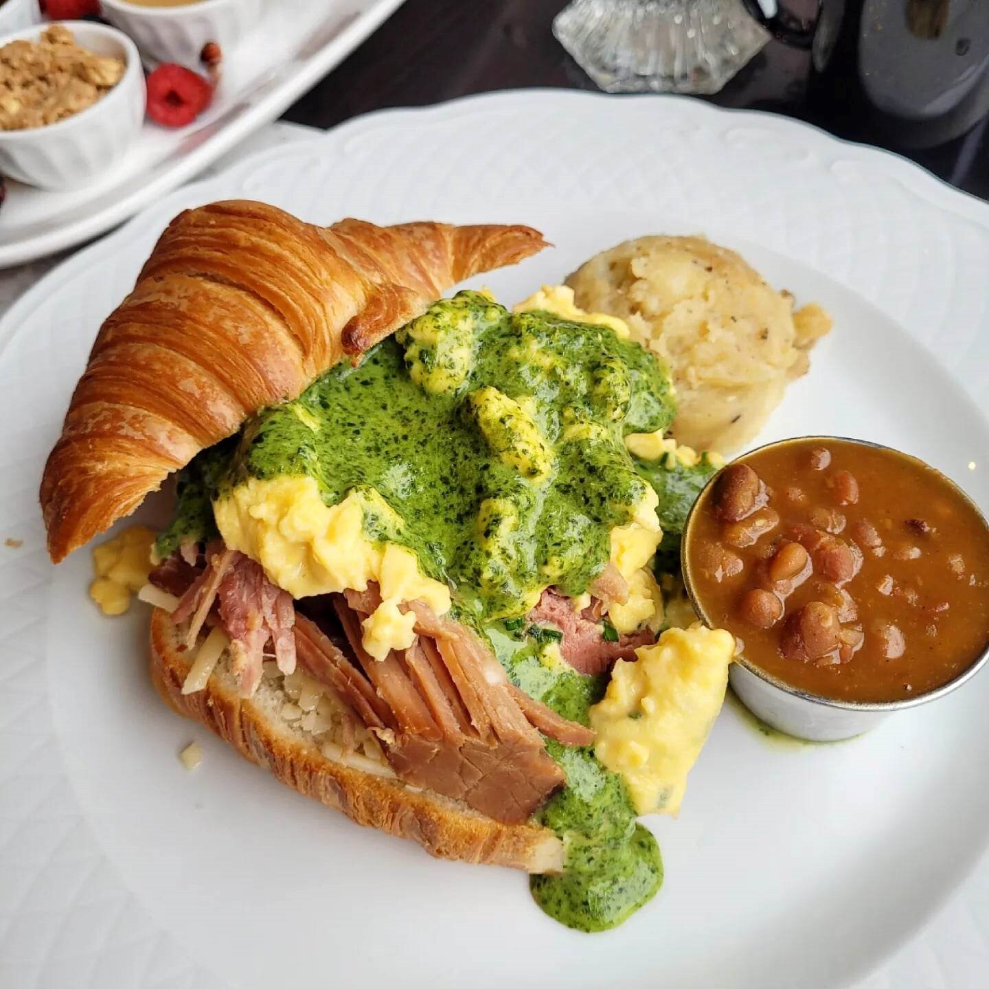 Le « Chic Croissant », quant à lui, est garni d’une brouillade d’œufs, de jambon effiloché maison, de cheddar vieilli, puis nappé d’une béchamel aux épinards. Même si la béchamel manquait d’assaisonnement, c’est une fois les composants réunis que les bouchées se balancent. Des bonnes fèves aux lards qui goûtent celles de grand-maman et des patates pilées viennent compléter l’assiette.