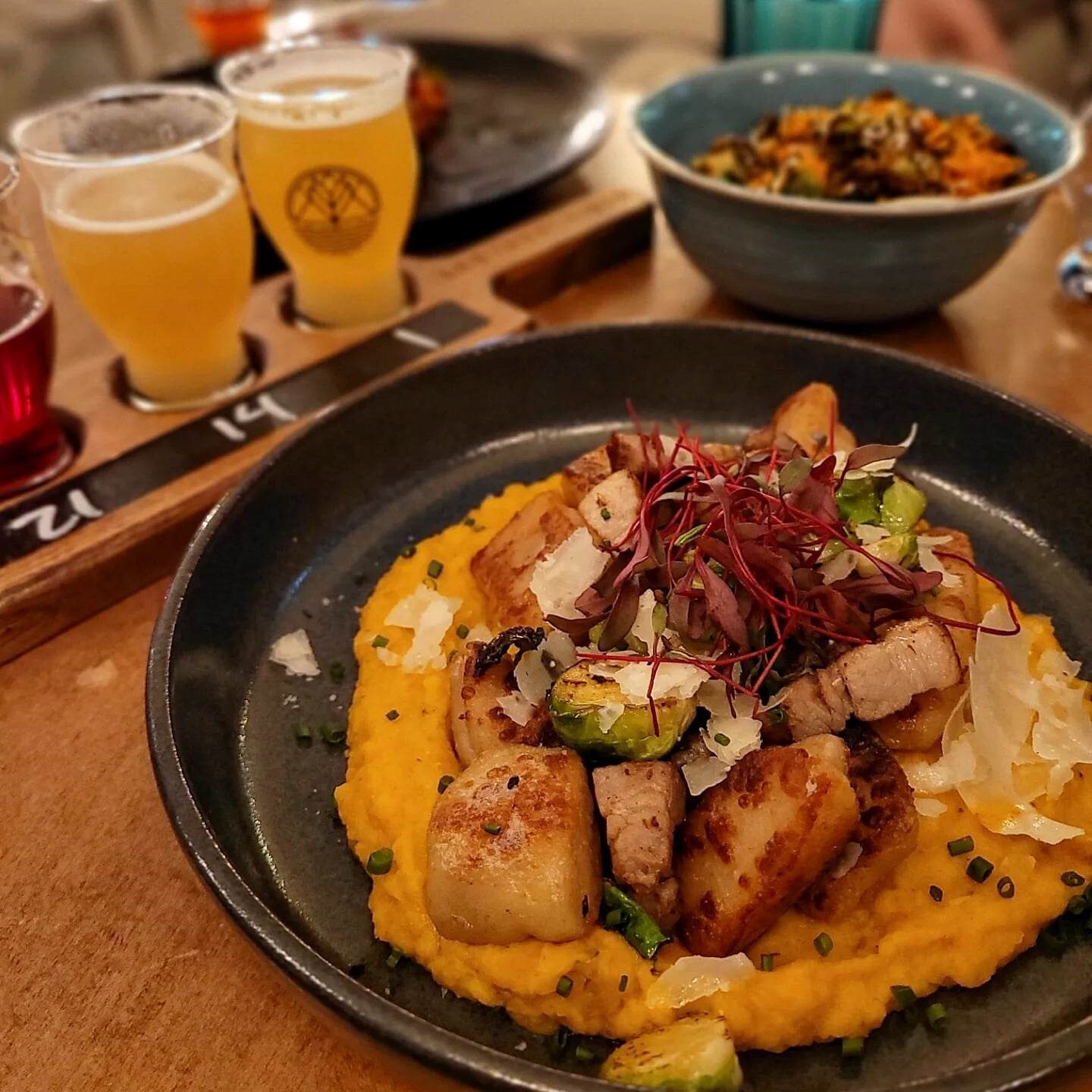 Prenons par exemple l’assiette de choux de Bruxelles et celui du poulet frit à la péruvienne, tous deux au menu depuis le jour 1, qui, avec leur profil aromatique à la fois sucré, salé, acidulé et légèrement relevé, sauront parfaitement accompagner autant La Lyzée (Pale Ale 100% Québec), que la Bikini Island (IPA). Quant à mes gnocchis de courge à l’allure d’un cumulonimbus, ces derniers déposés sur une brume de purée du même légume, bordés par quelques lardons à l’extrémité croustillante et de choux de Bruxelles al dente, se sont valu l’honneur du plat réconfortant de l’hiver.