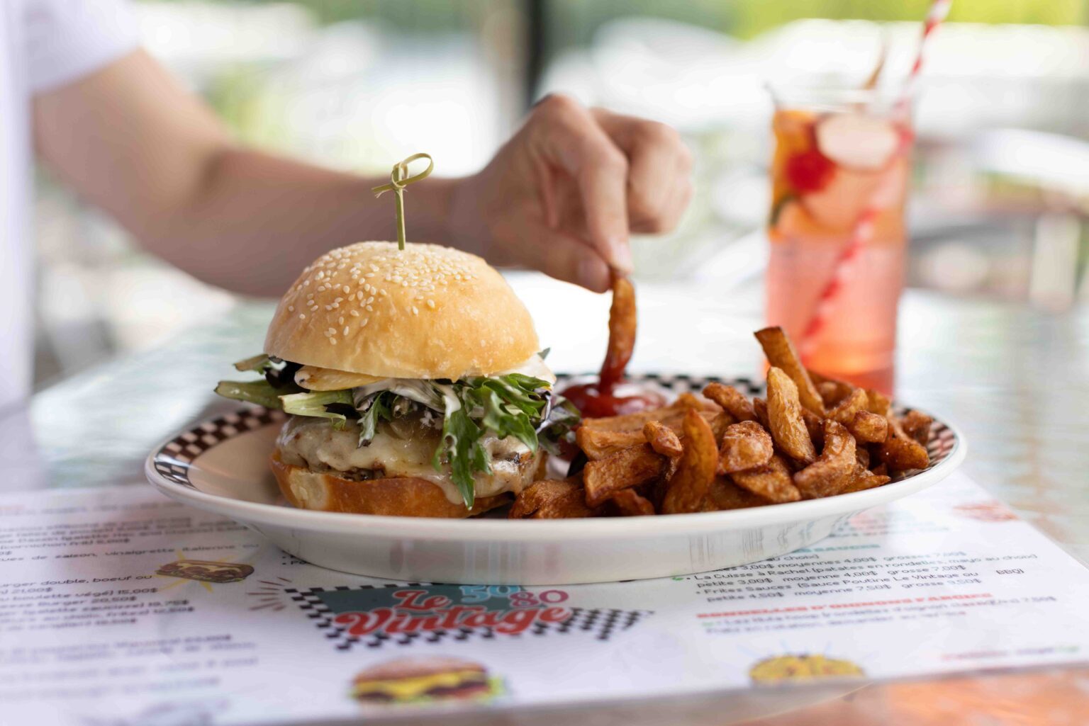 Bienvenue au Vintage 5080 situé à Sherbrooke, qui se définit comme un fast food de luxe où les aliments d’ici rencontrent l’ambiance électrisante des années 50 à 80. Burgers artisanaux, poutines décadentes, milkshakes originaux : on savoure tout ça dans un décor à la fois coloré et nostalgique ou sur leur terrasse donnant sur la rivière Magog lors d’une belle journée d’été. Imaginez un jukebox en marche, de la bonne musique, des soirées karaoké et même de la danse… On se croirait tout droit sorti du film Retour vers le futur ou Brillantine! Derrière ce concept unique et audacieux, on retrouve un duo passionné et visionnaire : Marie-Claude Matte et Bernard Beaulieu.
