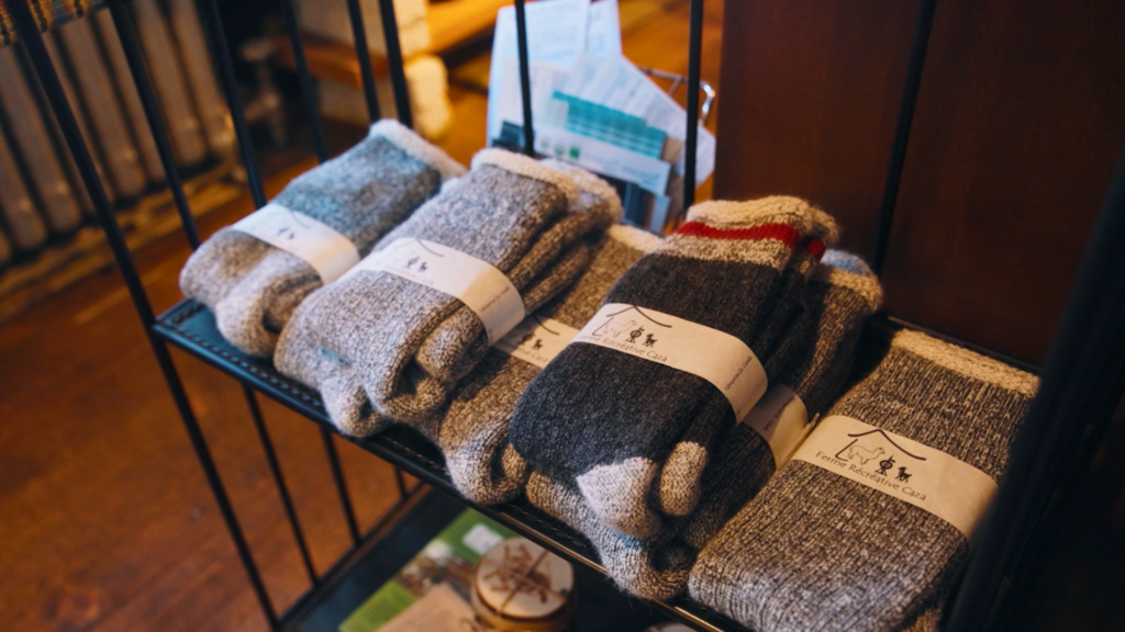 La ferme accueille aussi les visiteurs pour observer les animaux de près, en apprendre davantage sur leur élevage et découvrir la transformation artisanale de leur fibre naturelle, chaude et durable. La boutique met d’ailleurs en valeur cette matière exceptionnelle à travers une sélection de produits faits à la ferme (bas thermiques, fil à tricoter, produits en feutre et plus encore), ainsi que de la viande issue de leur élevage responsable.